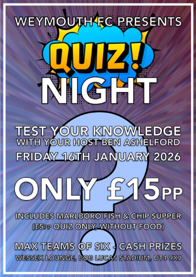 WFC Quiz Night Quiz Night Preview Quiz Night: Friday 16th January 2026 CASH Prizes ! £15 per person – includes food from the Marlboro restaurant. Raffle on the evening… Teams of 6 (Max) Join us for an entertaining evening Bar open from 6.30pm for quiz to start at 7.00pm Buy Tickets Details Date Time League Season 16th January 2026 6:30 pm Fund Raising 2024/25 Ground Bob Lucas Stadium Wessex Stadium, Radipole Lane, Weymouth DT4 9XJ, United Kingdom Related